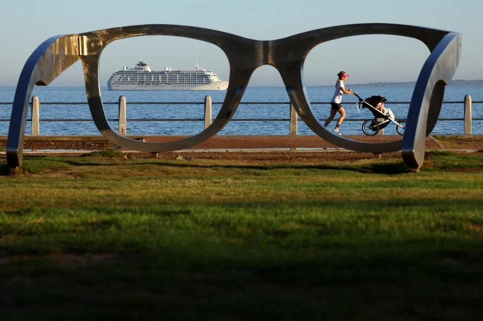 Joggers and a huge cruise ship, The World, are seen from Cape Town’s Sea Point Promenade in South Africa on Wednesday.