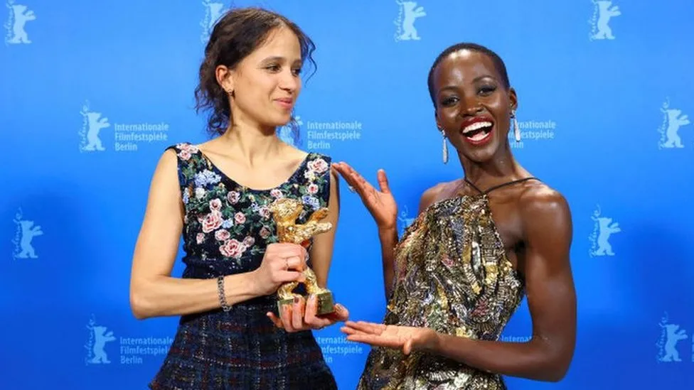 Also on Saturday, French-Senegalese filmmaker Mati Diop poses with Berlinale Jury President Lupita Nyong’o after winning the Best Film award for her feature Dahomey.