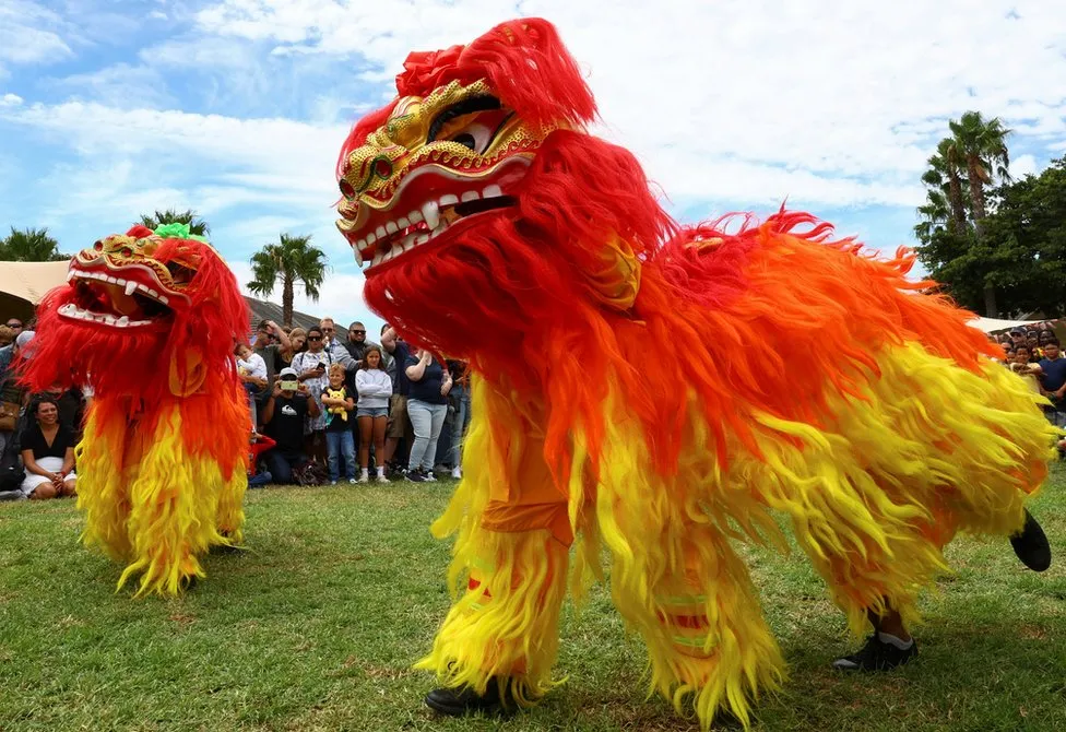 In the same city on Saturday, people watch the lion dance during the Lunar Year of the Dragon festivities.