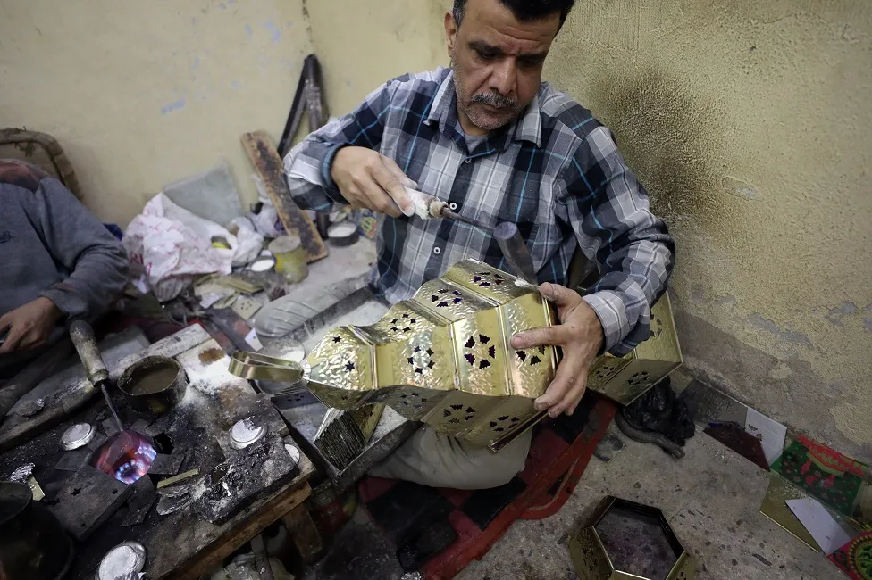 An Egyptian craftsman makes Ramadan lanterns, known as Fanous, in Cairo on Tuesday.