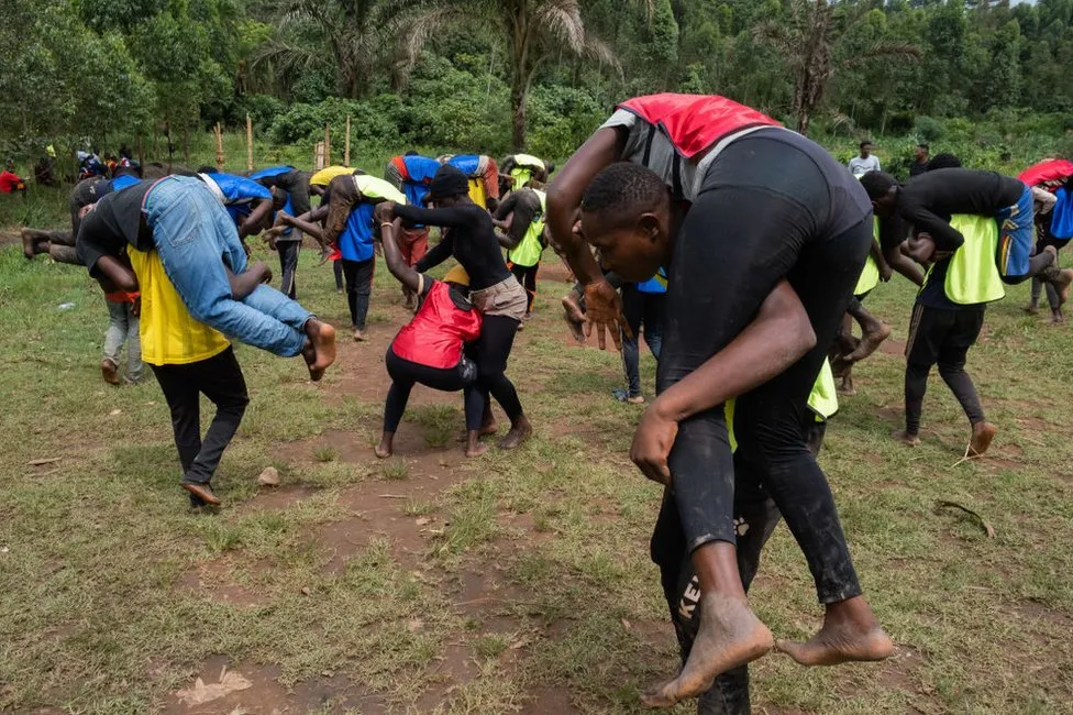 Members of Uganda’s Soft Ground Wrestling group carry each other during a training session on Wednesday. Their antics are gaining a big internet following.