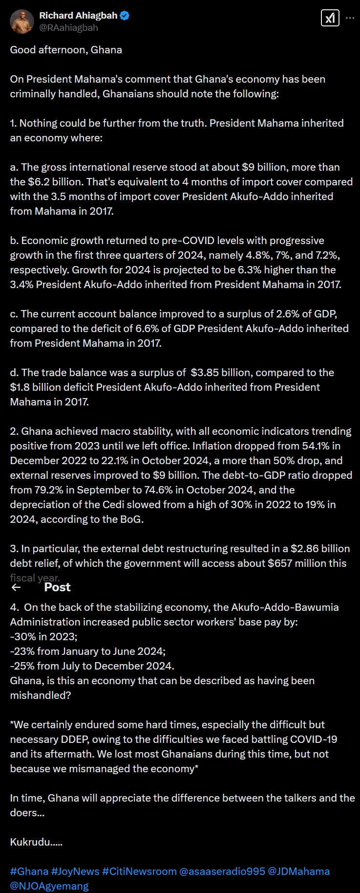 Ahiagbah asserts that the Akufo-Addo government implemented tough but necessary measures, such as external debt restructuring that secured $2.86 billion in relief. He also points to increases in public sector wages-30% in 2023, with further increments planned for 2024-as efforts to alleviate economic burdens.