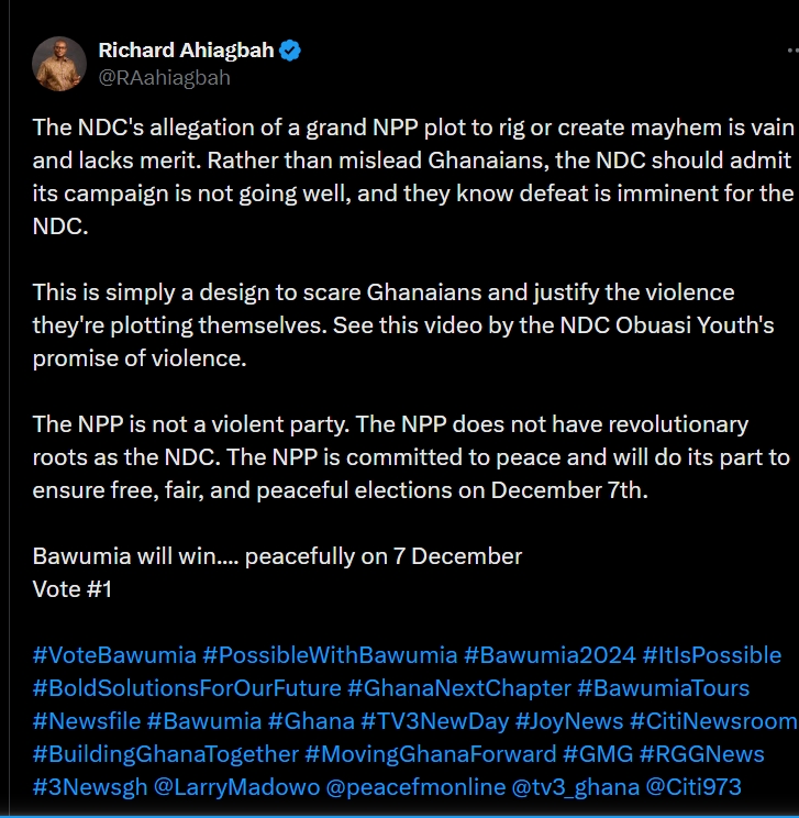 In a post shared on X (formerly Twitter), Mr. Ahiagbah asserted that the NDC’s accusations lack merit and are part of a calculated effort to mislead Ghanaians. “The NDC’s allegation of a grand NPP plot to rig or create mayhem is vain and lacks merit. Rather than mislead Ghanaians, the NDC should admit its campaign is not going well, and they know defeat is imminent,” he said.