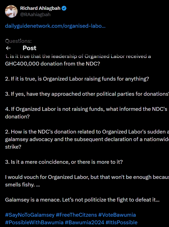 Building on these concerns, Mr. Ahiagbah’s post raised several pointed questions: “Is it true that the leadership of Organized Labor received a GHC400,000 donation from the NDC? If it is true, is Organized Labor raising funds for anything? If yes, have they approached other political parties for donations? If Organized Labor is not raising funds, what informed the NDC’s donation? How is the NDC’s donation related to Organized Labor’s sudden anti-galamsey advocacy and the subsequent declaration of a nationwide strike? Is it a mere coincidence, or is there more to it? I would vouch for Organized Labor, but that won’t be enough because it smells fishy…”