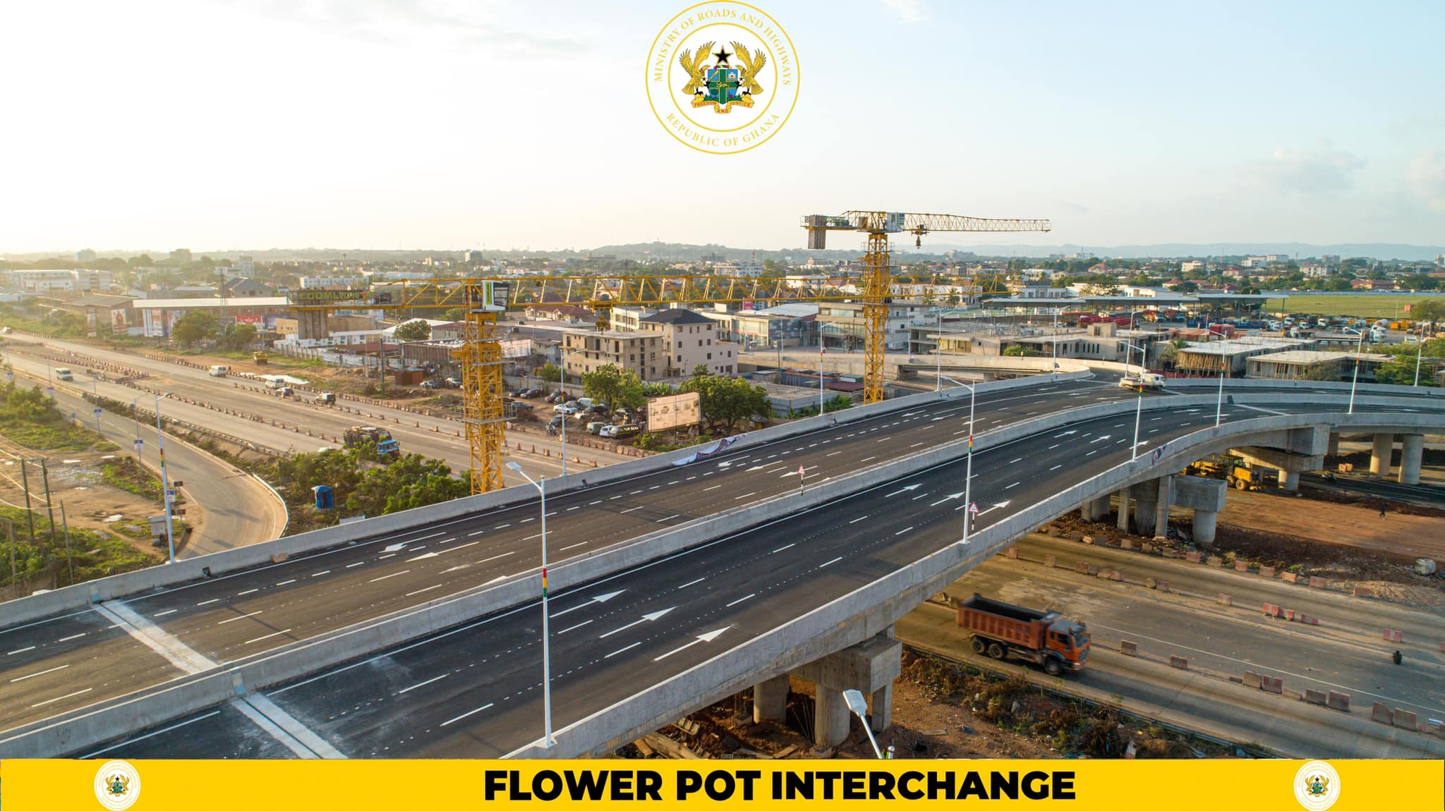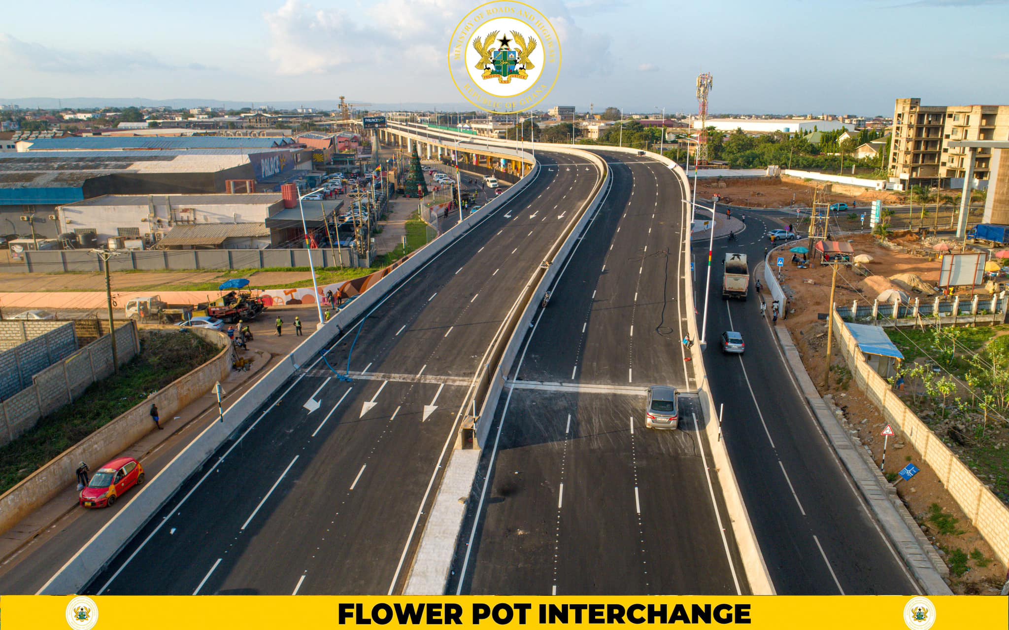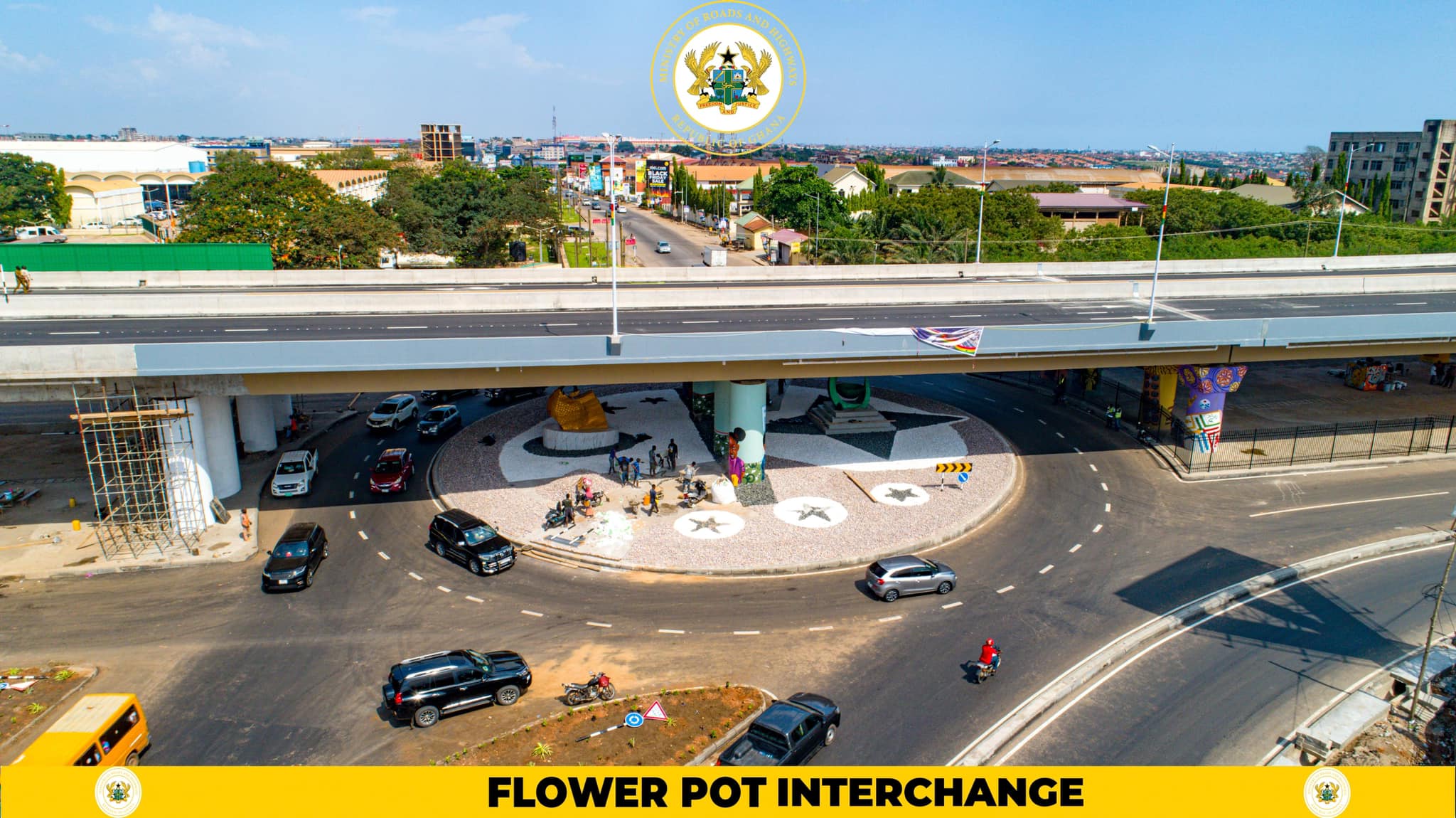 The Flowerpot Interchange, constructed by China Railway No. 5 Engineering Ghana Limited with Deoke Consult Ltd as consultants, cost GHS 677.8 million and was jointly funded by the Government of Ghana and Afrexim Bank.