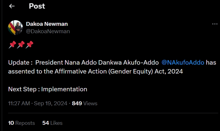 The Minister for Gender, Children, and Social Protection, Dakoa Newman, has announced that President Nana Addo Dankwa Akufo-Addo has signed into law the Affirmative Action (Gender Equity) Act, 2024.