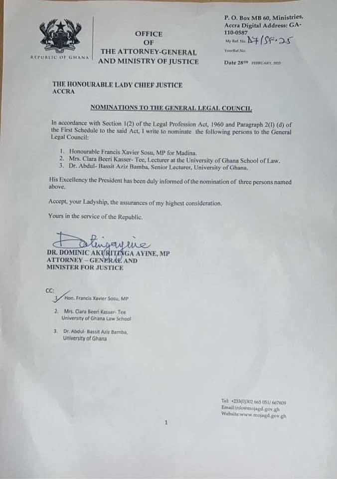 The Attorney-General and Minister of Justice, Dr. Dominic Ayine, has nominated three individuals to serve on the General Legal Council (GLC), the body responsible for regulating the legal profession in Ghana.
