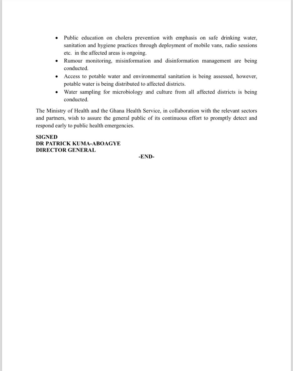 The Ghana Health Service has confirmed cases of cholera in the Ada West and Ada East districts of the Greater Accra Region. The first case was reported on 4 October 2024, when a patient from Ada West presented with vomiting, diarrhoea, and abdominal pain after attending a funeral in Ada East. By 11 October, nine cases had been confirmed in the two districts.