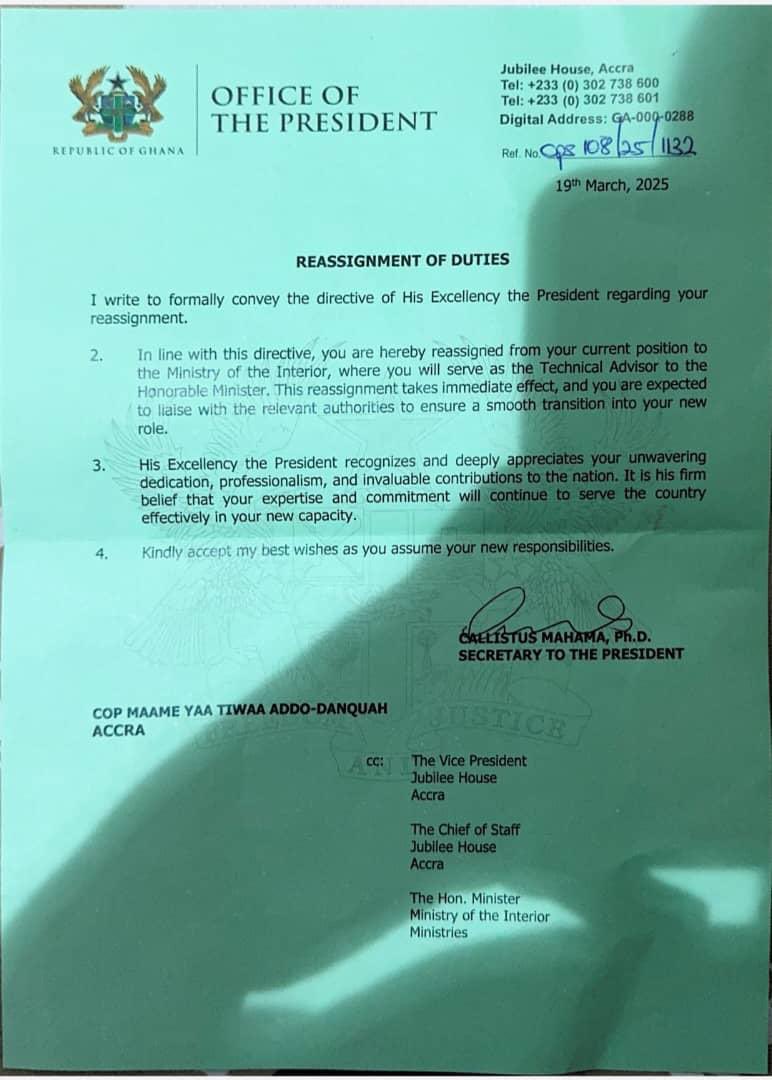 Commissioner of Police (COP) Maame Yaa Tiwaa Addo-Danquah has been reassigned to the Interior Ministry as a Technical Adviser to the Minister. This change comes just hours after the newly appointed Inspector-General of Police (IGP), COP Christian Tetteh Yohuno, named her as the Director-General of Research and Planning at the Ghana Police Service.