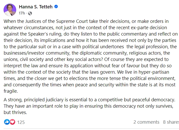 Former Foreign Minister Hanna Tetteh has expressed concerns about the Supreme Court’s consideration of public sentiment in important rulings.