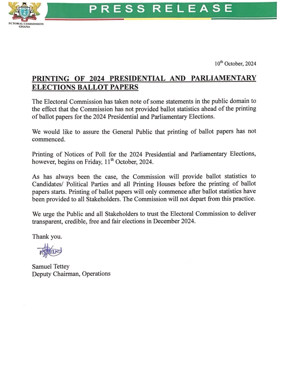 The Commission has reaffirmed that the printing of ballot papers for the 2024 elections will only commence once ballot statistics have been provided to all stakeholders, including candidates, political parties, and printing houses.