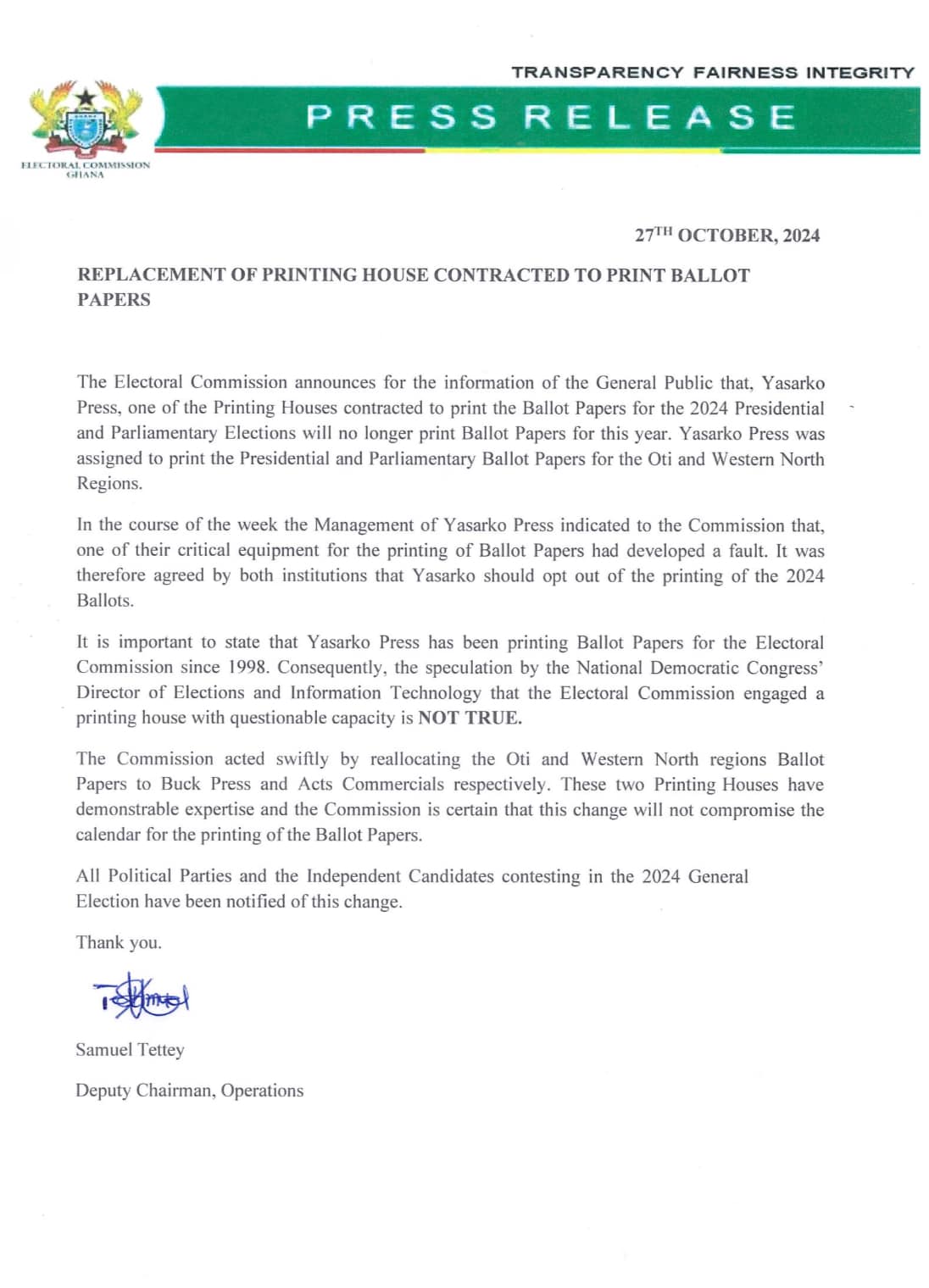 The Electoral Commission (EC) has announced a change in its printing arrangements for the 2024 Presidential and Parliamentary election ballots, stating that Yasarko Press, originally tasked with printing ballots for the Oti and Western North Regions, will no longer be handling the assignment due to a technical fault in its equipment.