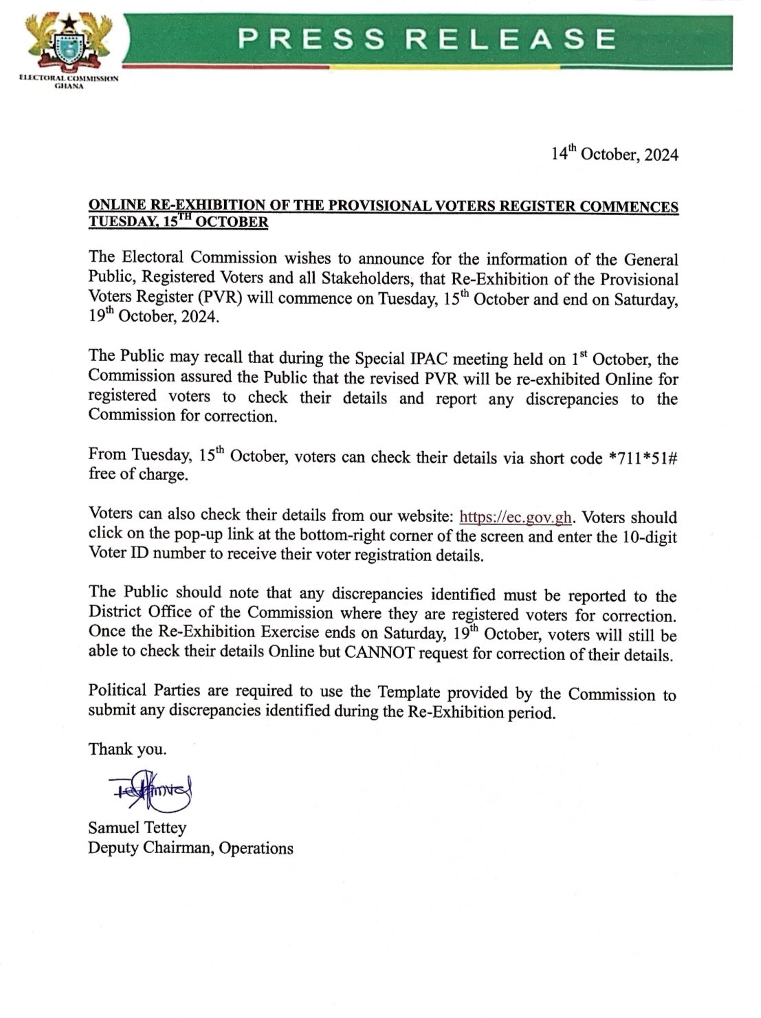 The Electoral Commission (EC) has announced that the re-exhibition of the Provisional Voters Register (PVR) will begin on Tuesday, 15th October 2024, and will run until Saturday, 19th October 2024.