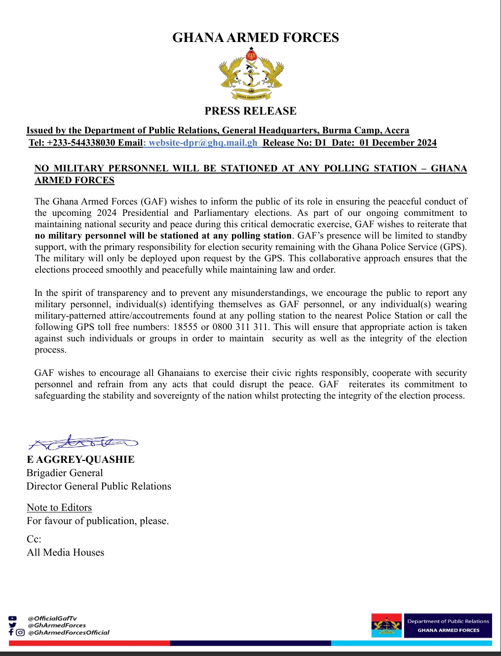 Reiterating its dedication to national stability, GAF emphasized its role in safeguarding the sovereignty of Ghana and upholding the credibility of the elections.