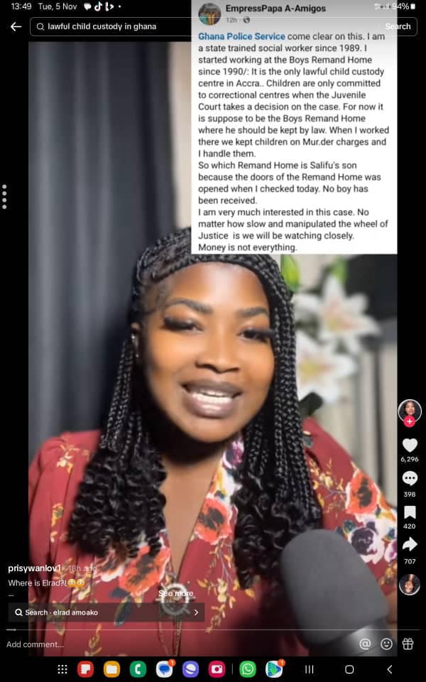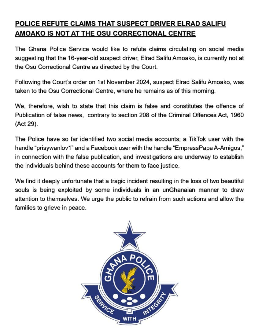The Ghana Police Service has issued a statement refuting claims circulating on social media that Elrad Salifu Amoako, a 16-year-old driver who was recently implicated in a tragic incident, is not currently detained at the Osu Correctional Centre as mandated by a court order.