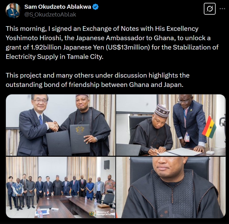 The Minister for Foreign Affairs, Samuel Okudzeto Ablakwa, announced the development in a post on X, stating that he signed an Exchange of Notes with Japan’s Ambassador to Ghana, Yoshimoto Hiroshi, to formalize the agreement.