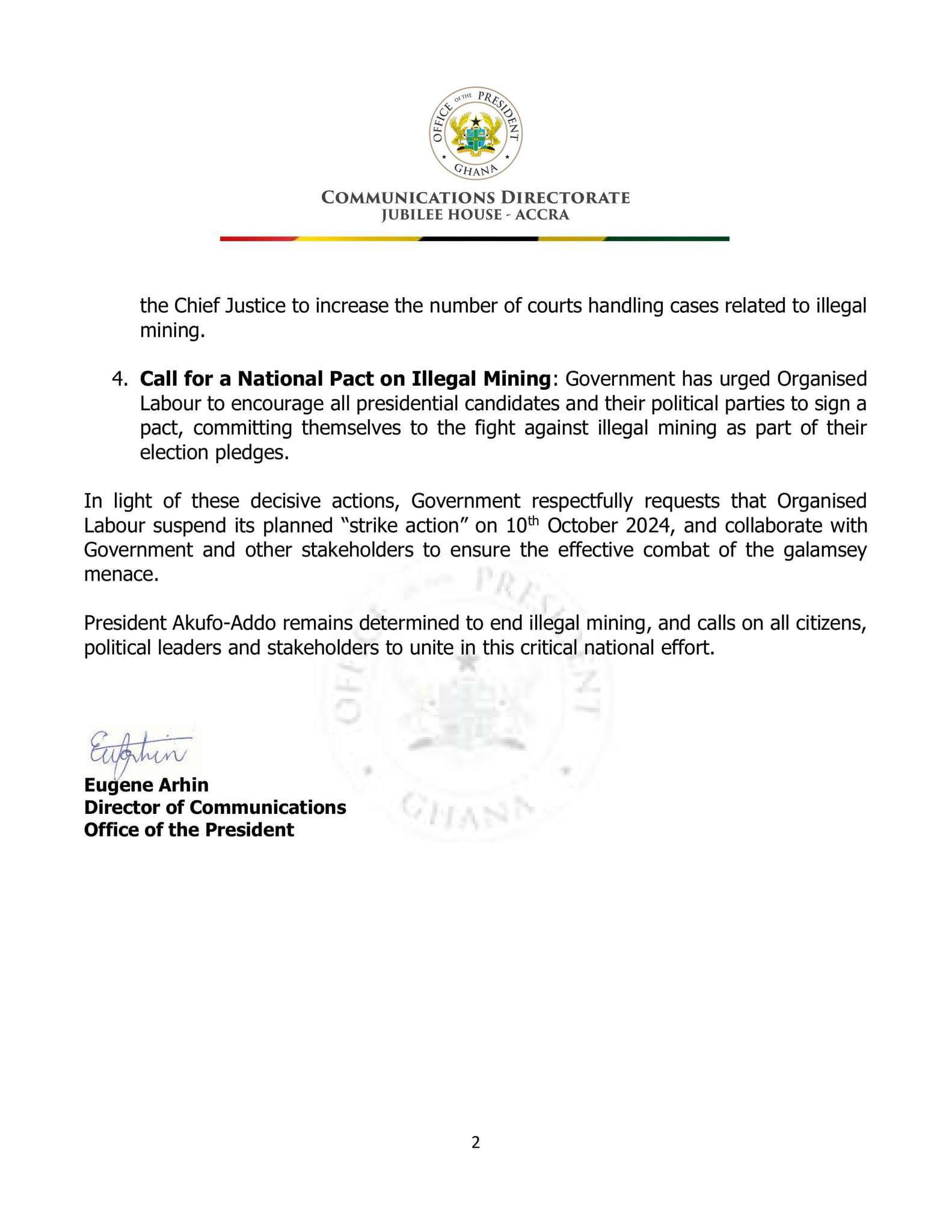 In a move to combat the escalating threat of illegal mining, known locally as galamsey, the government is calling on Organised Labour to spearhead a national pact among political parties.