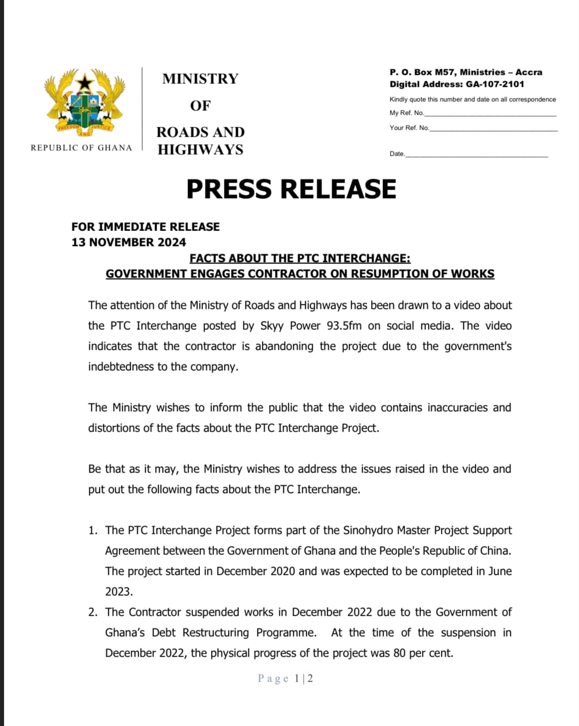 The Ministry of Roads and Highways has responded to claims made in a recent video posted by Skyy Power 93.5fm, which suggested that the contractor for the PTC Interchange project had abandoned the site due to the government’s indebtedness to the company.