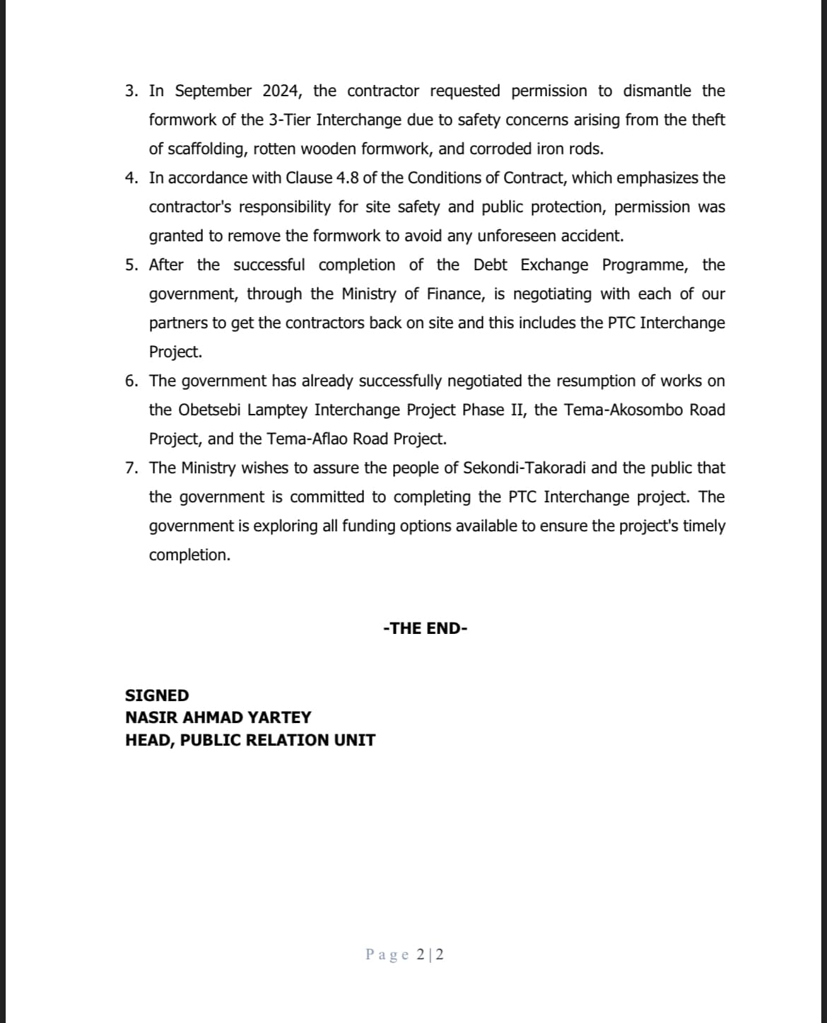 “The Ministry wishes to assure the people of Sekondi-Takoradi and the public that the government is committed to completing the PTC Interchange project. The government is exploring all funding options available to ensure the project’s timely completion.”
