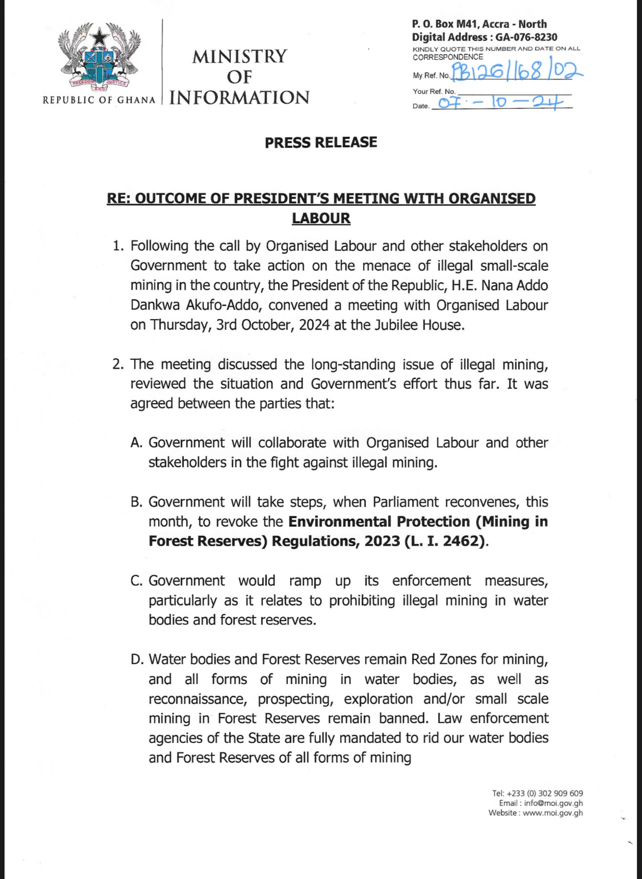 The government has voiced its surprise at the decision by Organised Labour to proceed with an industrial strike on October 10, 2024, over concerns about the ongoing illegal small-scale mining (galamsey) in the country. This follows a recent high-level meeting between President Nana Addo Dankwa Akufo-Addo and representatives of Organised Labour, which took place on October 3, 2024, at the Jubilee House.