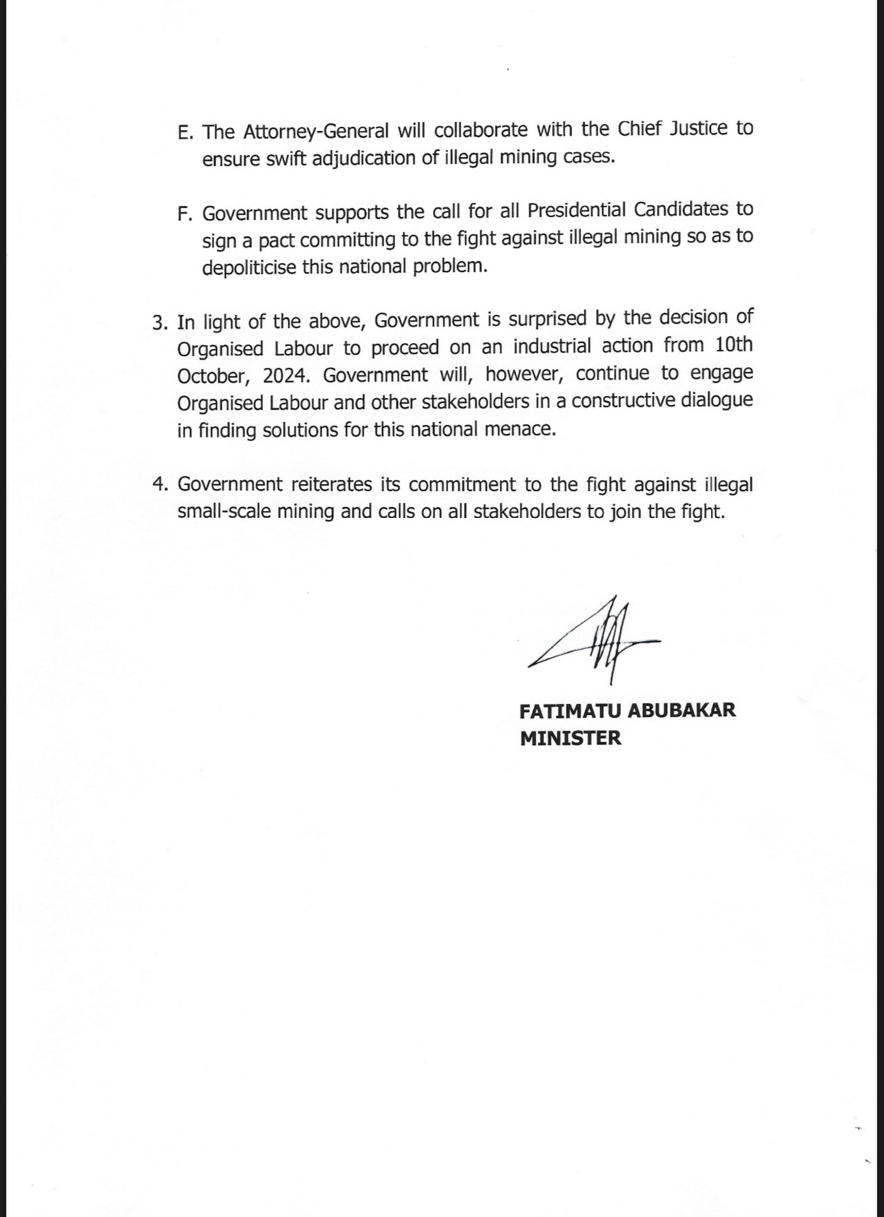 In a statement issued by Information Minister Fatimatu Abubakar on October 7, 2024, the government expressed disappointment at the decision to move forward with the strike but reassured the public of its commitment to finding lasting solutions. “The government remains committed to engaging with Organised Labour and other stakeholders in ongoing, constructive dialogue to combat illegal small-scale mining,” the statement read.