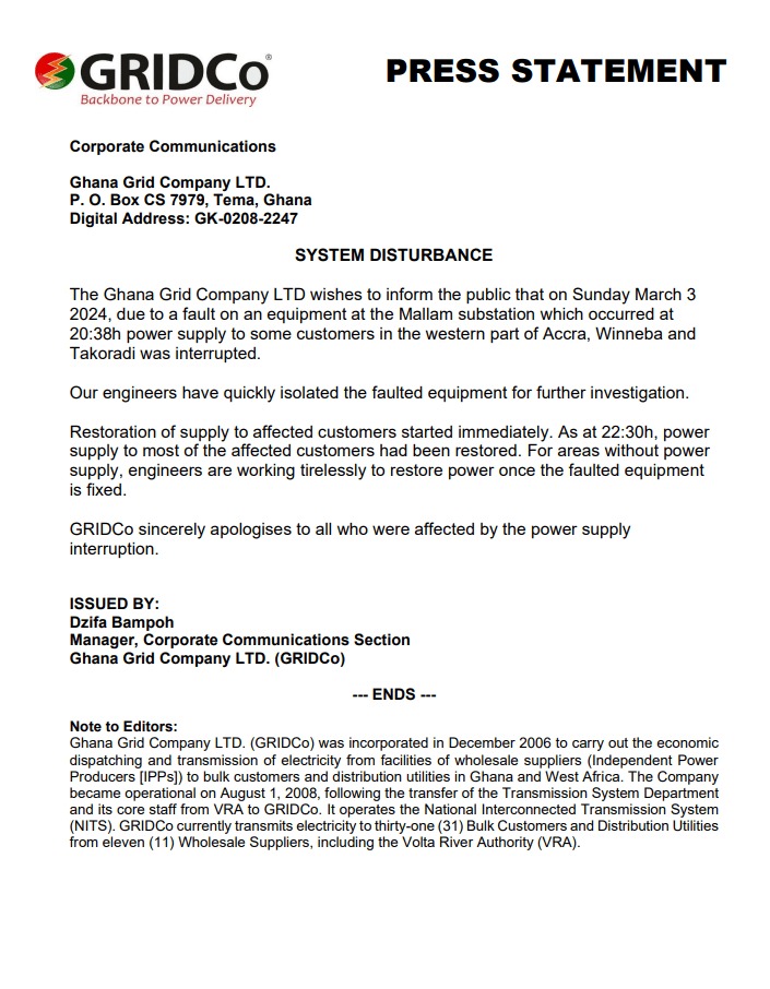 Ghana Grid Company Limited (GRIDCo ) extends its apology to consumers in the western part of Accra, Winneba, and Takoradi following power cuts on Sunday, March 3, 2024.