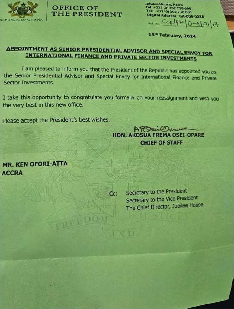 Ken Ofori Atta appointed as a Senior Presidential Advisor and Special Envoy