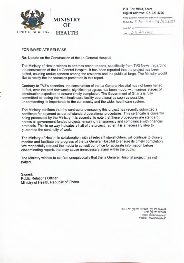 The Ministry of Health has addressed recent reports regarding the construction of the La General Hospital, which have raised concerns among residents. Contrary to claims made by TV3, the Ministry assures the public that the project has not been halted.