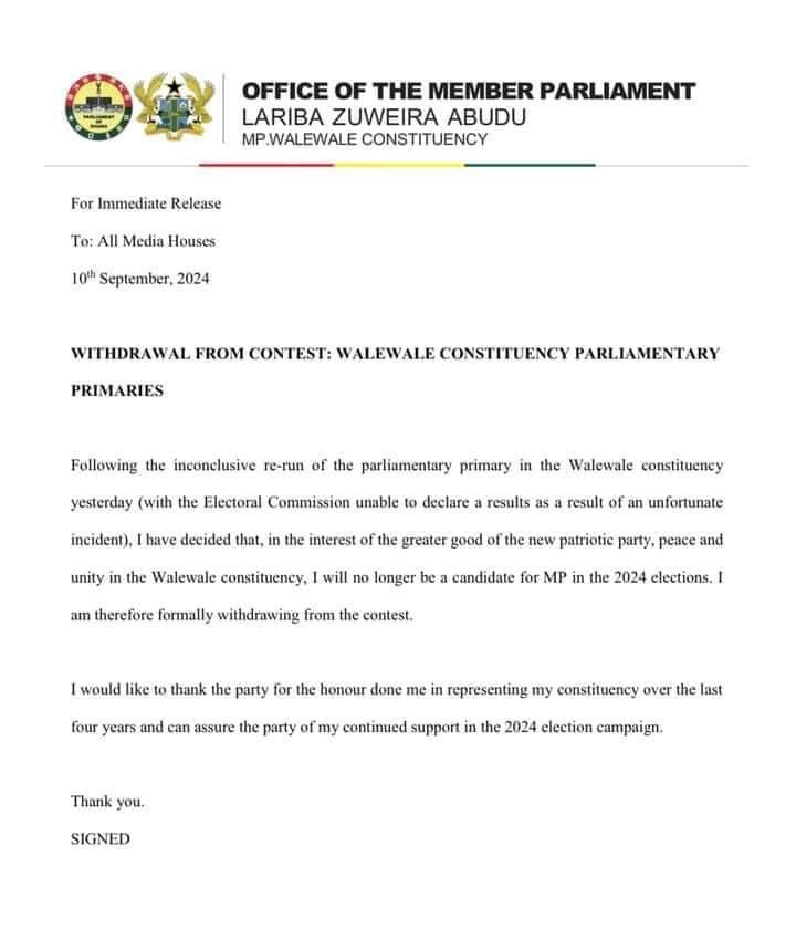 Lariba Abudu, the Member of Parliament for Walewale, has withdrawn from the New Patriotic Party (NPP) primaries following a contentious rerun marred by disruptions and irregularities.