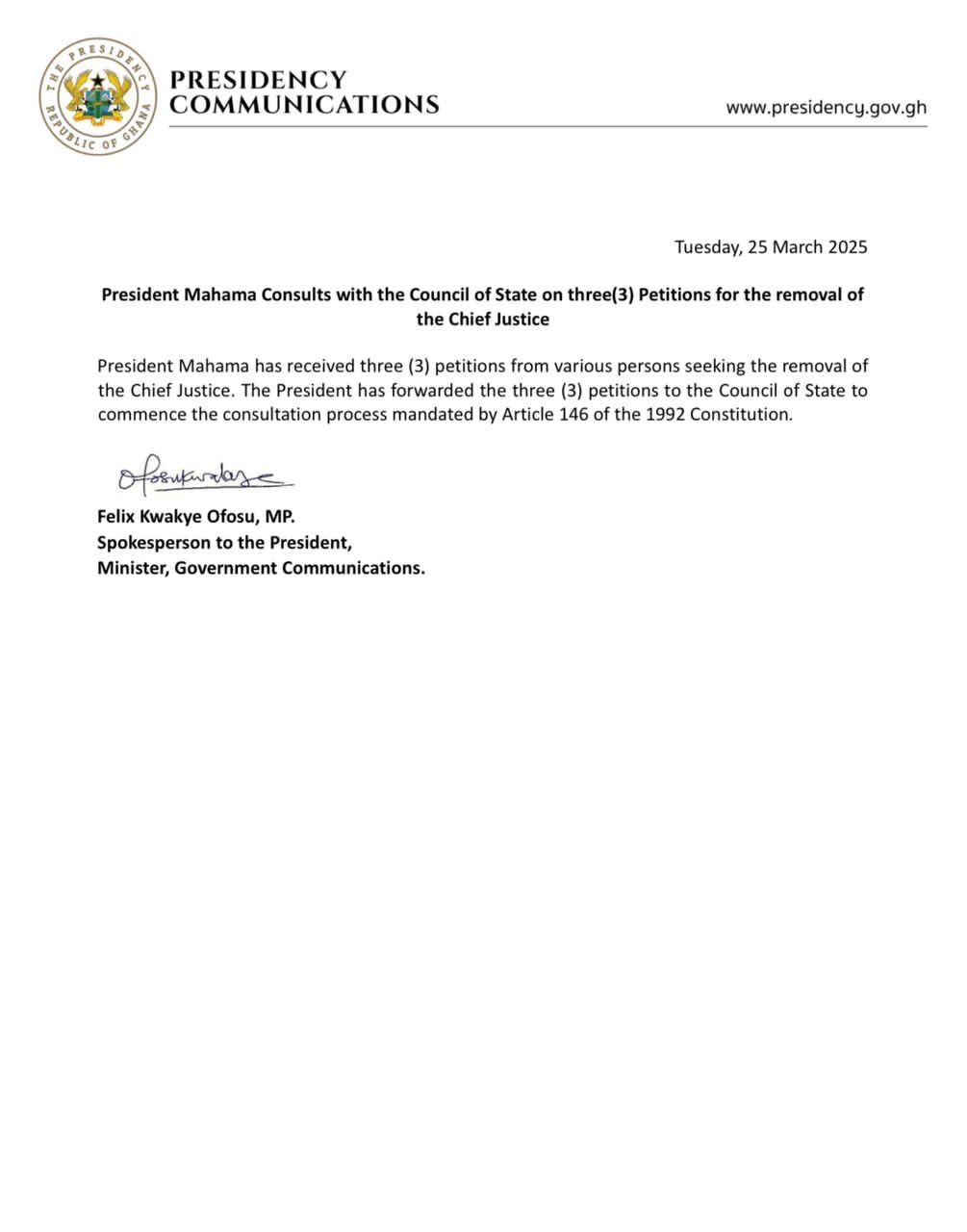 President John Dramani Mahama has initiated consultations with the Council of State after receiving three petitions seeking the removal of Chief Justice Gertrude Sackey Torkornoo. In a statement released on Tuesday, March 25, 2025, Felix Kwakye Ofosu, Spokesperson to the President and Minister for Government Communications, confirmed that the petitions have been forwarded to the Council in accordance with Article 146 of the 1992 Constitution.