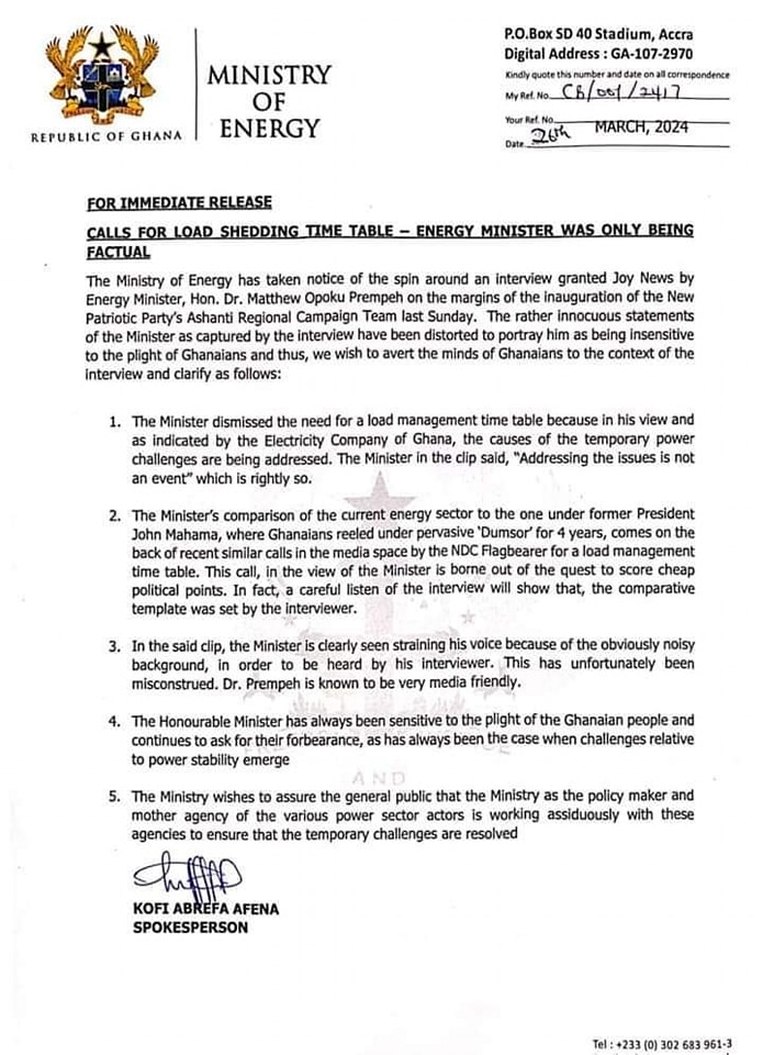 In light of recent discussions surrounding remarks made by Energy Minister, Dr. Matthew Opoku Prempeh, in an interview with Joy News, the Ministry of Energy has issued a statement to provide clarity and context to his statements.