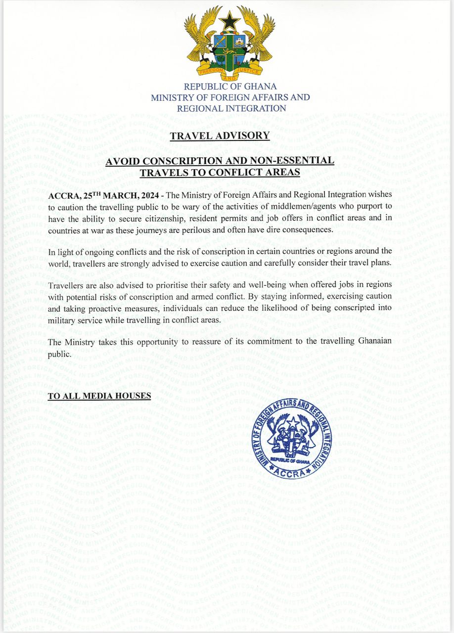 The Ministry of Foreign Affairs and Regional Integration has issued a travel advisory urging the public to avoid conscription and non-essential travel to conflict areas.