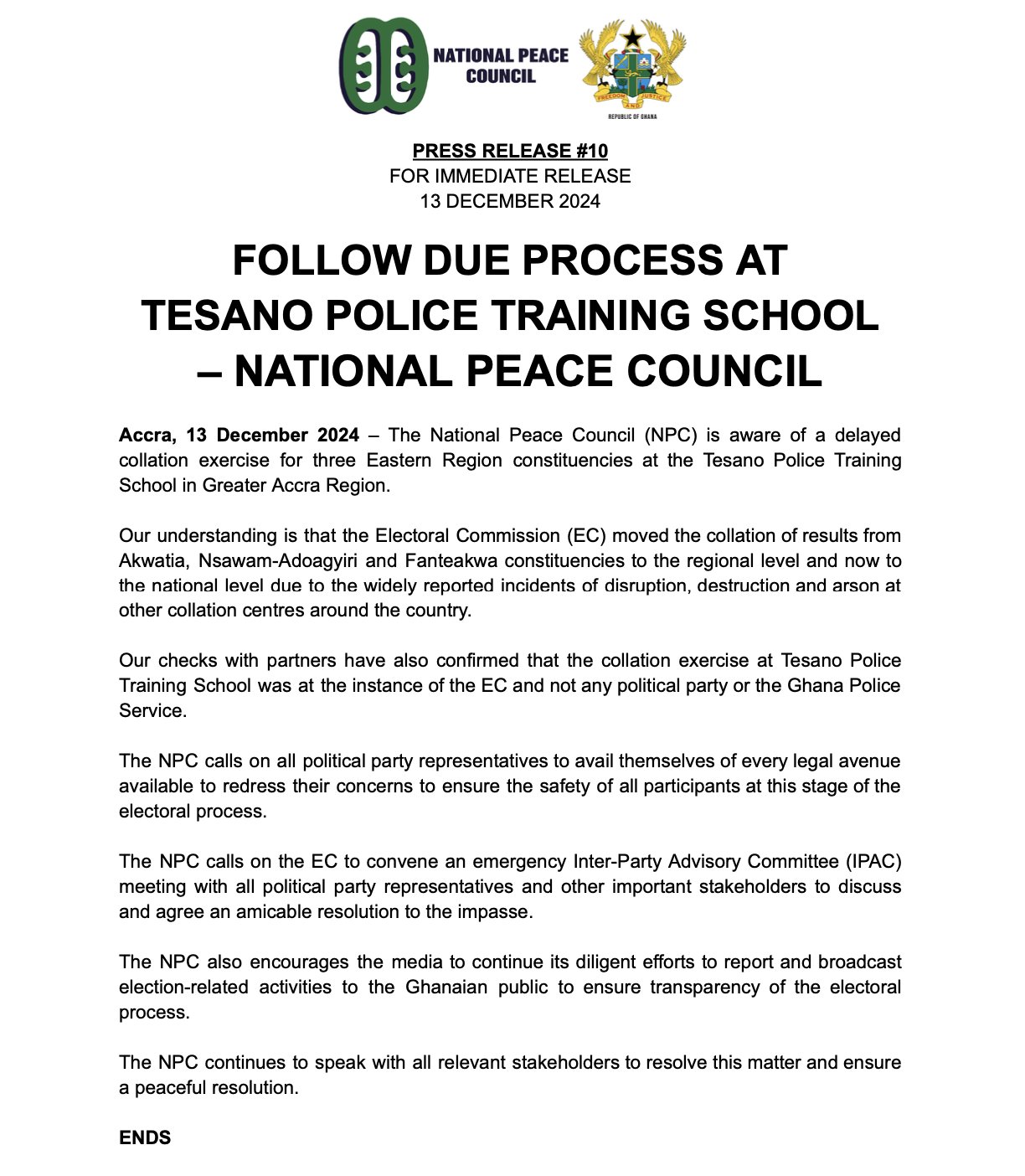 The National Peace Council (NPC) has called on political parties to adhere to legal processes and ensure the safety of participants involved in the delayed collation of election results at the Tesano Police Training School in Accra.