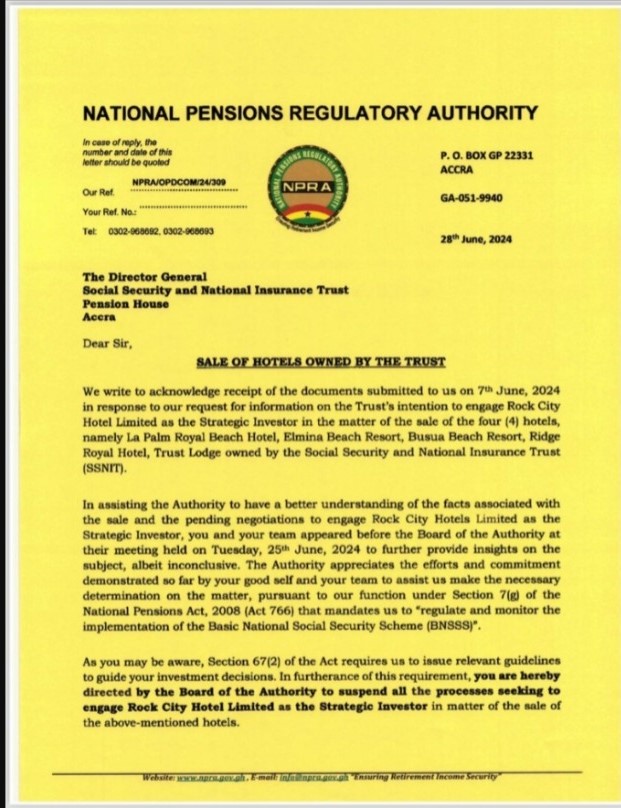 The National Pensions Regulatory Authority (NPRA) has issued a directive to the Social Security and National Insurance Trust (SSNIT) to suspend the sale of its hotels to Rock City Hotel Limited.