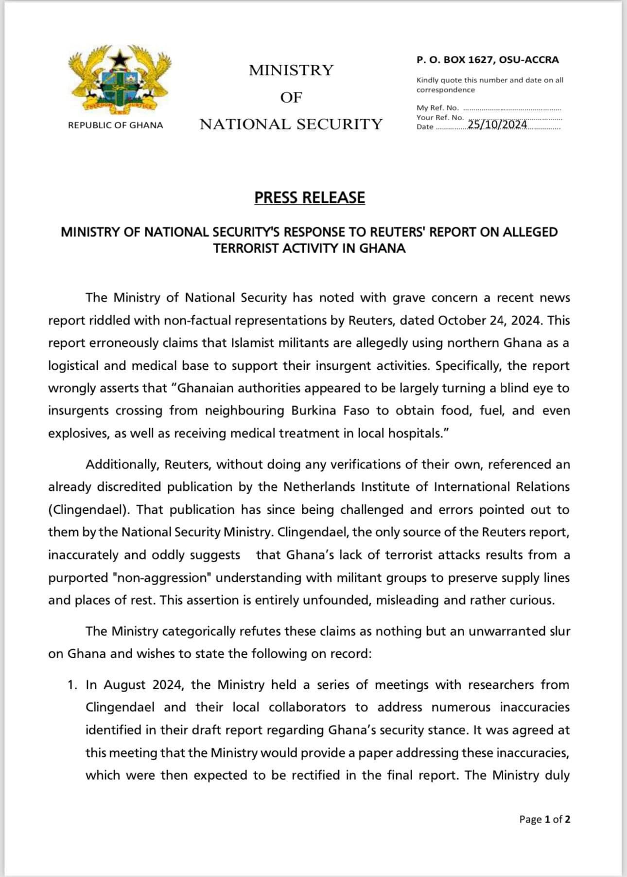 The statement also clarified that the Ministry had met with Clingendael researchers in August 2024 to address “numerous inaccuracies identified in their draft report regarding Ghana’s security stance.” The Ministry explained it had submitted a paper to Clingendael, refuting the claims of any alleged alignment with militant activities and expecting corrections to be reflected in the final publication.