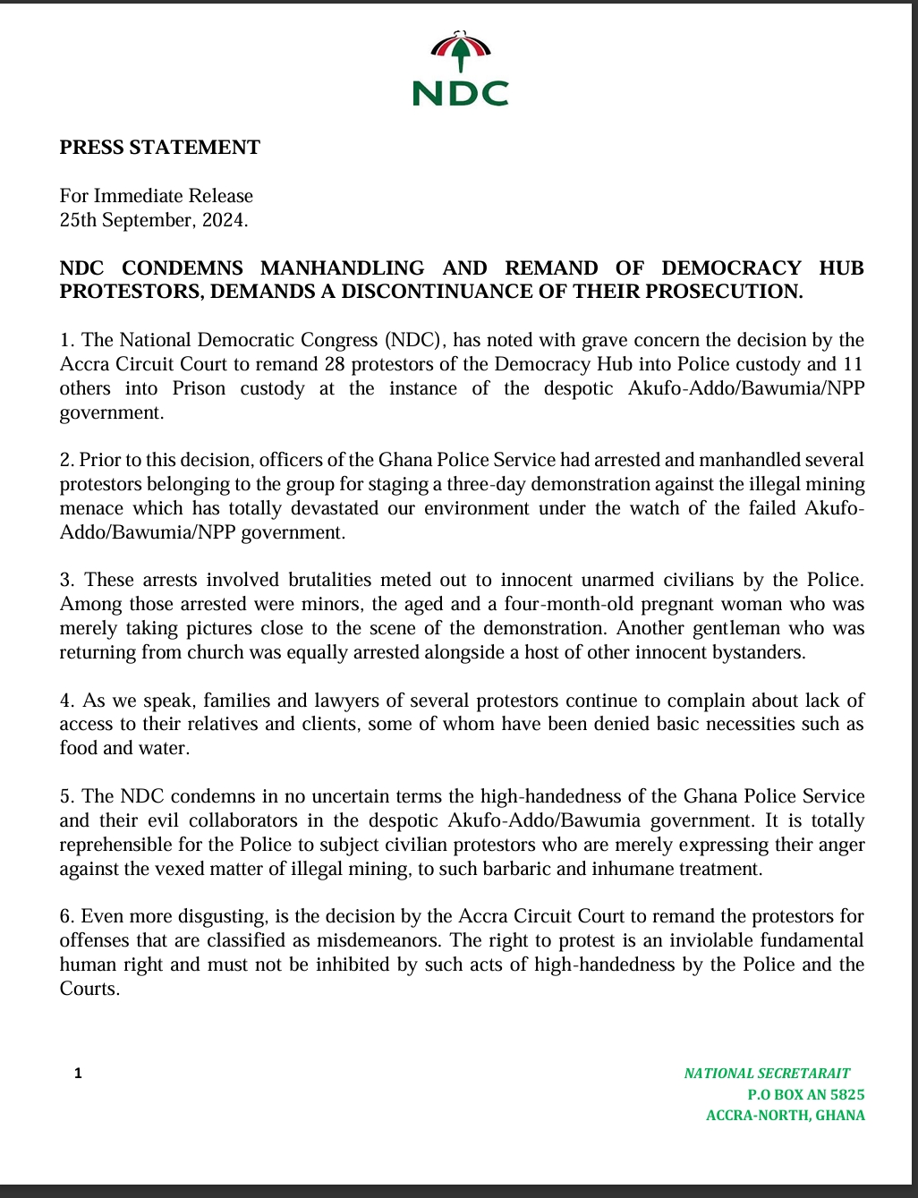 The National Democratic Congress (NDC) has criticized the treatment and detention of protestors at the Democracy Hub and is demanding a stop to their prosecution. In a press release, the party expressed serious concern over the decision of the Accra Circuit Court to remand 28 protestors in police custody and 11 others in prison.