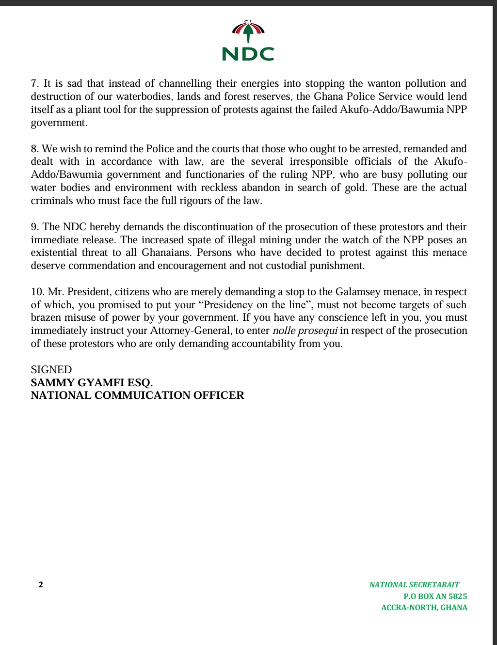 The NDC further condemned the court’s decision to remand the protestors for misdemeanors, stressing that “the right to protest is an inviolable fundamental human right and must not be inhibited by such acts of high-handedness by the Police and the Courts.”