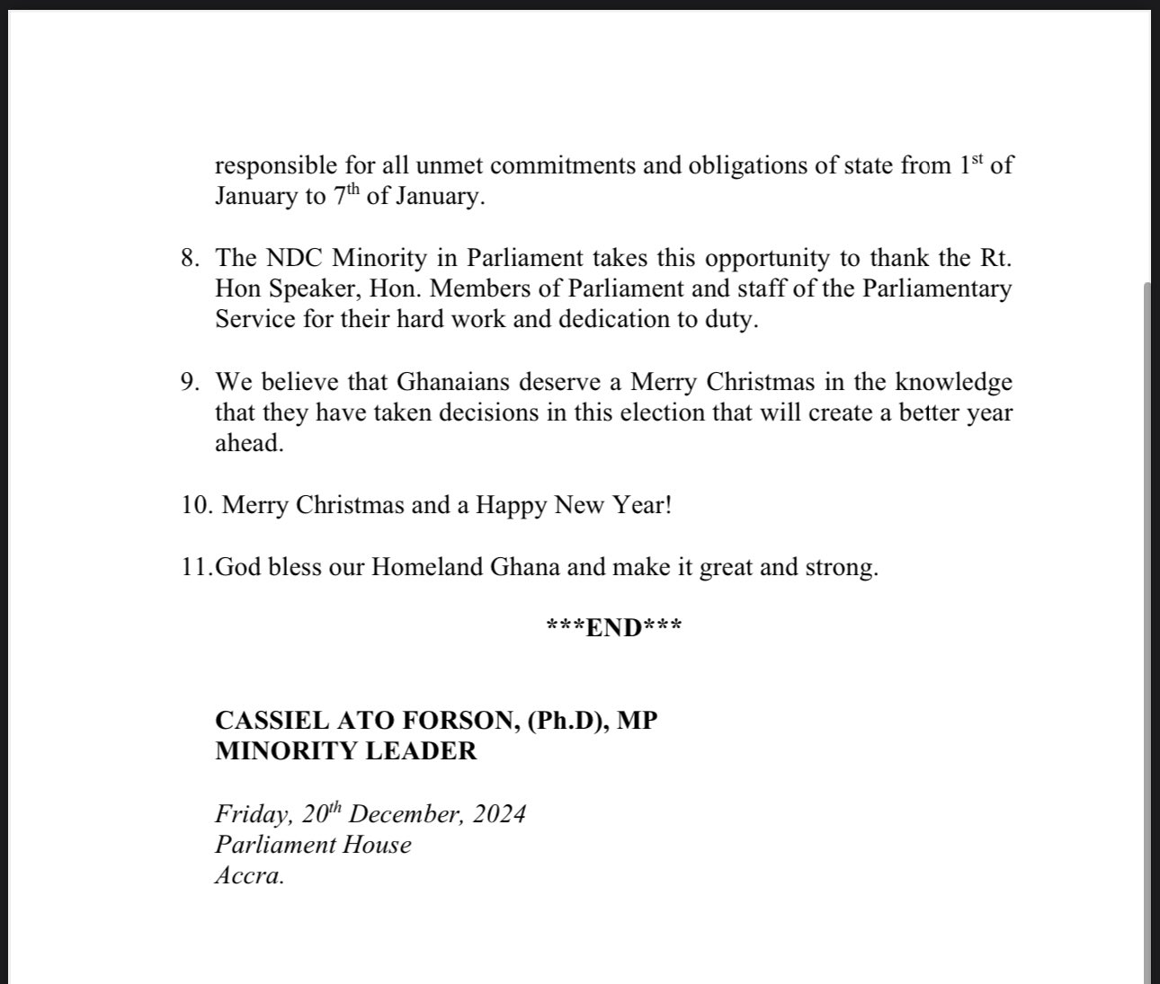 The statement concluded with a message of optimism, thanking Ghanaians for their choices in the recent elections and wishing them a Merry Christmas and a prosperous New Year.