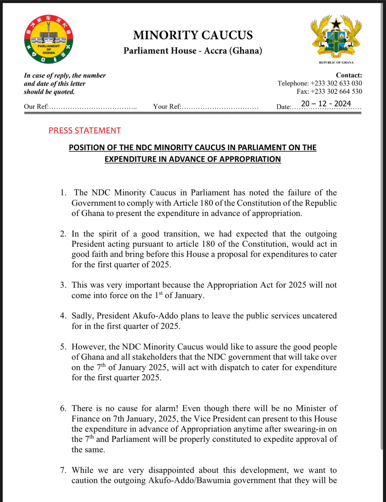 The Minority assured Ghanaians that an NDC-led government, expected to assume office on January 7, 2025, would act promptly to address this shortfall. “Even though there will be no Minister of Finance on January 7, the Vice President can present the expenditure in advance of appropriation anytime after being sworn in, and Parliament will expedite its approval,” the statement added.
