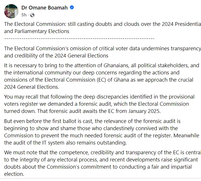 Dr. Boamah further detailed omissions in the final register presented by the EC, which lacked key data such as national and regional voter statistics, absentee voter data, gender breakdowns, and information on proxy voters. “By withholding these vital statistics, the Electoral Commission is casting further doubts and clouds over the transparency of the upcoming elections and threatening the legitimacy of the electoral outcome,” he stated.