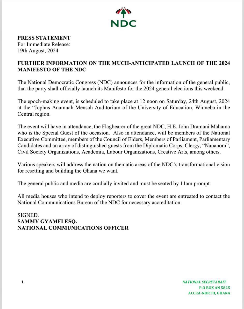 The party will launch its manifesto on Saturday, August 24, 2024. The event will take place at the “Jophus Anamuah-Mensah Auditorium of the University of Education, Winneba in the Central region.