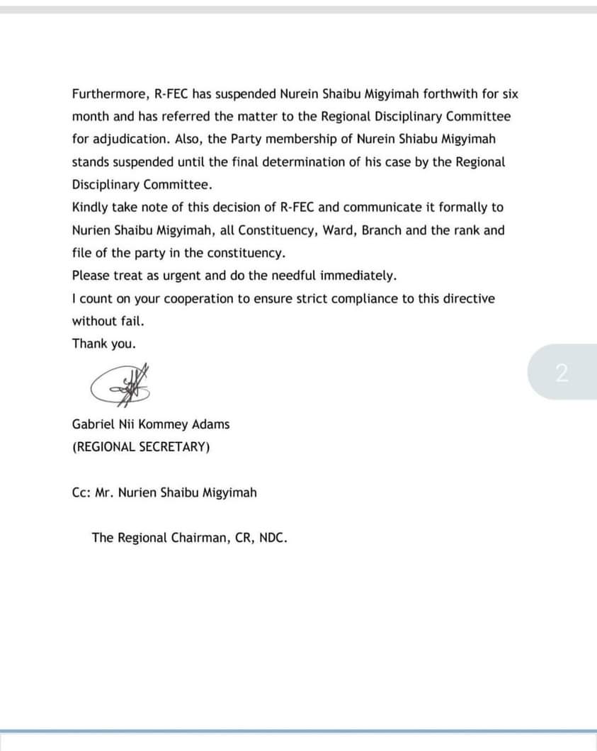 The Regional Functional Executive Committee has written to the Assin Central Chairman of the NDC, informing him of the suspension of Nurein Shiabu Migyimah for six months.