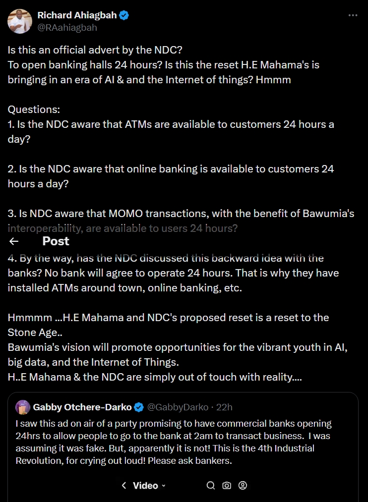 Richard Ahiagbah, Director of Communications for the New Patriotic Party (NPP), has raised questions about a viral video promoting a proposal by the National Democratic Congress (NDC) suggesting that banks should operate 24 hours a day.