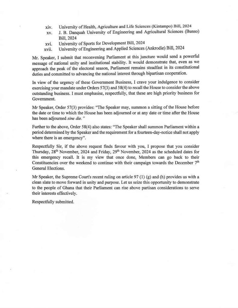 The New Patriotic Party (NPP) caucus has formally requested the Speaker of Parliament to reconvene the House to address outstanding government business that was left unattended following the adjournment of Parliament on November 7.