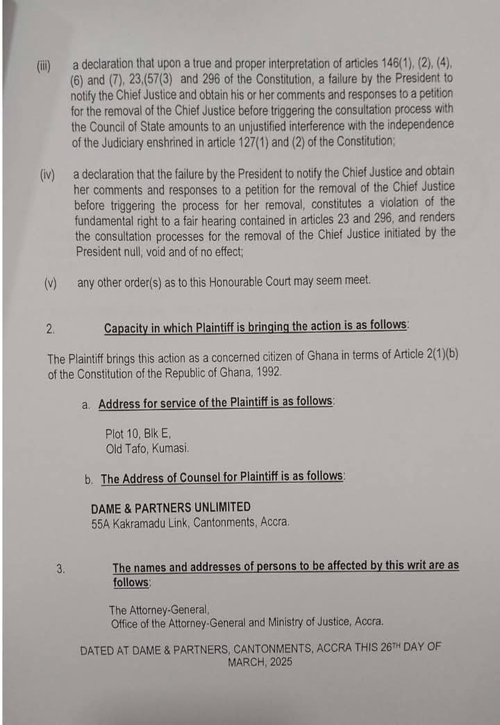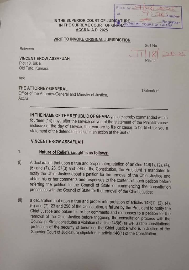 Article 146 of the 1992 Constitution outlines the procedure for the removal of a Chief Justice, including the President’s role in consulting the Council of State and appointing a committee to investigate such petitions. Assafuah’s suit seeks clarity on whether the Chief Justice must be given an opportunity to respond before the process is triggered.