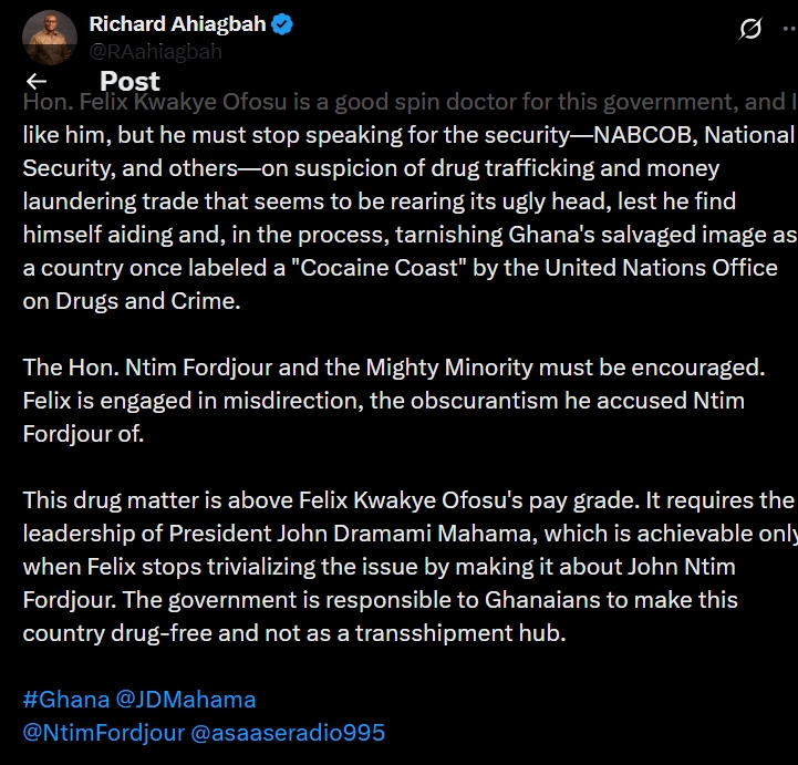 Mr. Ahiagbah also commended the NPP Minority Caucus, particularly Rev. John Ntim Fordjour, for bringing these matters to public attention. He cautioned Felix Kwakye Ofosu, Minister for Government Communications, against downplaying the seriousness of the allegations and urged the government to focus on ensuring that Ghana does not become a transshipment hub for narcotics.