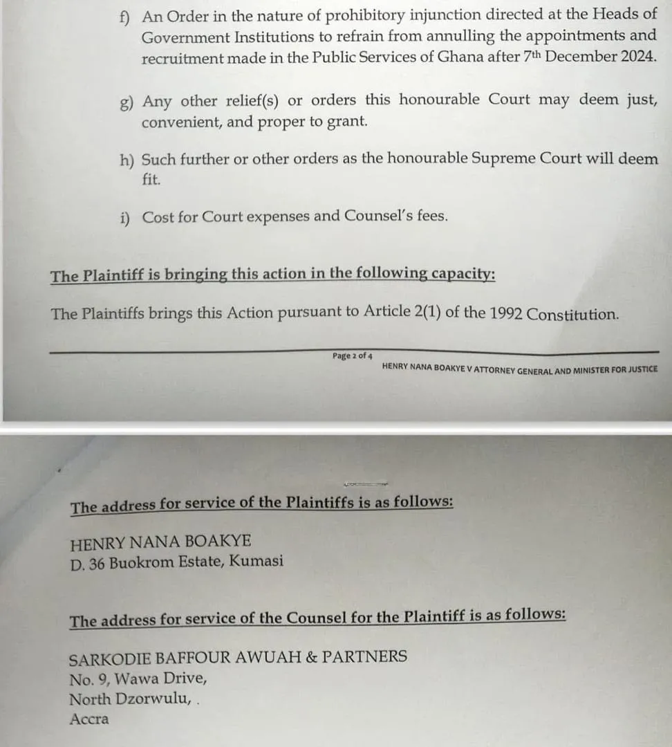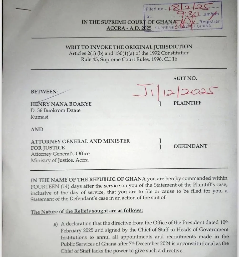 The National Organiser of the opposition New Patriotic Party (NPP), Henry Nana Boakye, has filed a lawsuit at the Supreme Court, contesting what he describes as the unlawful termination of public sector appointments made both before and after December 7, 2025.