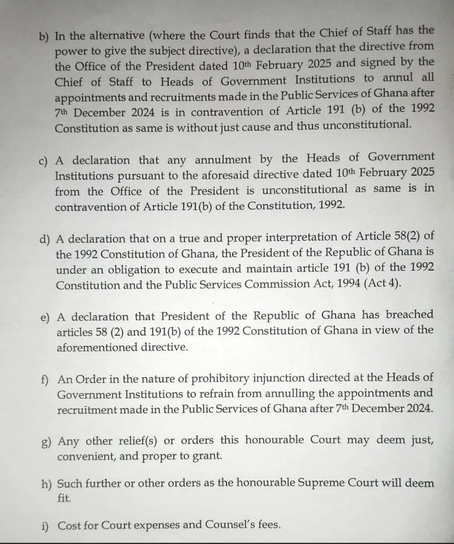 Nana Boakye argues that the directive, issued by the Chief of Staff on February 10, 2025, oversteps constitutional limits and violates Article 191(b) of the 1992 Constitution, which protects public service employees from dismissal without due process. According to him, neither the Chief of Staff nor the President has the authority to unilaterally revoke legally sanctioned appointments.
