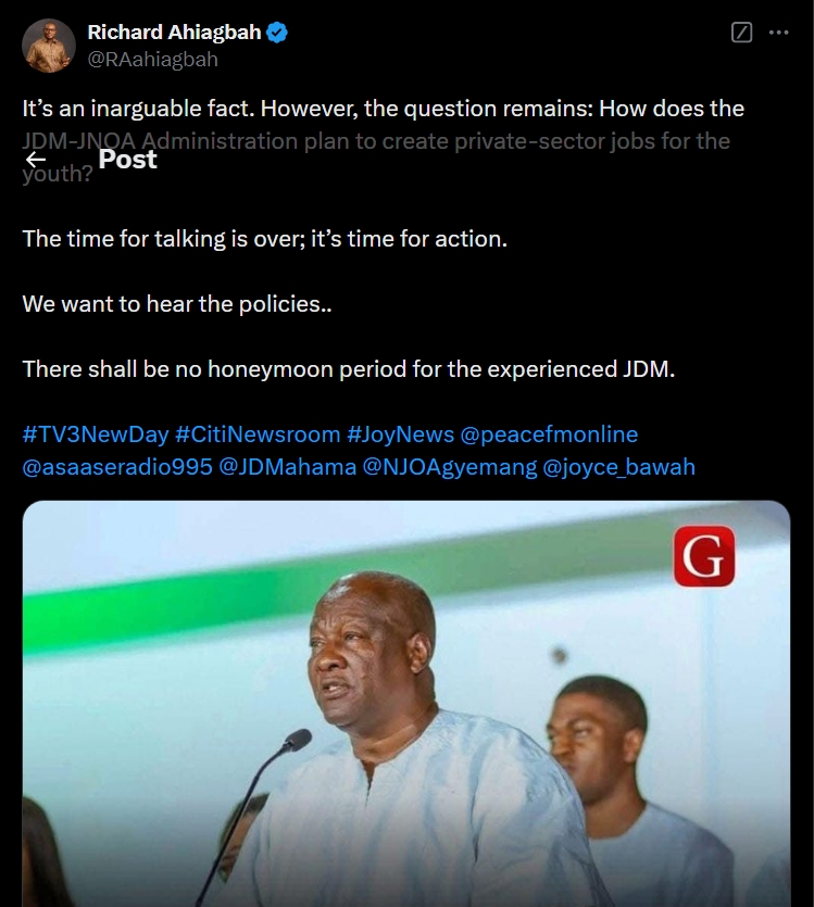 The New Patriotic Party (NPP) Director of Communications, Richard Ahiagbah, has challenged the incoming John Dramani Mahama (JDM) administration to outline concrete policies for private-sector job creation.
