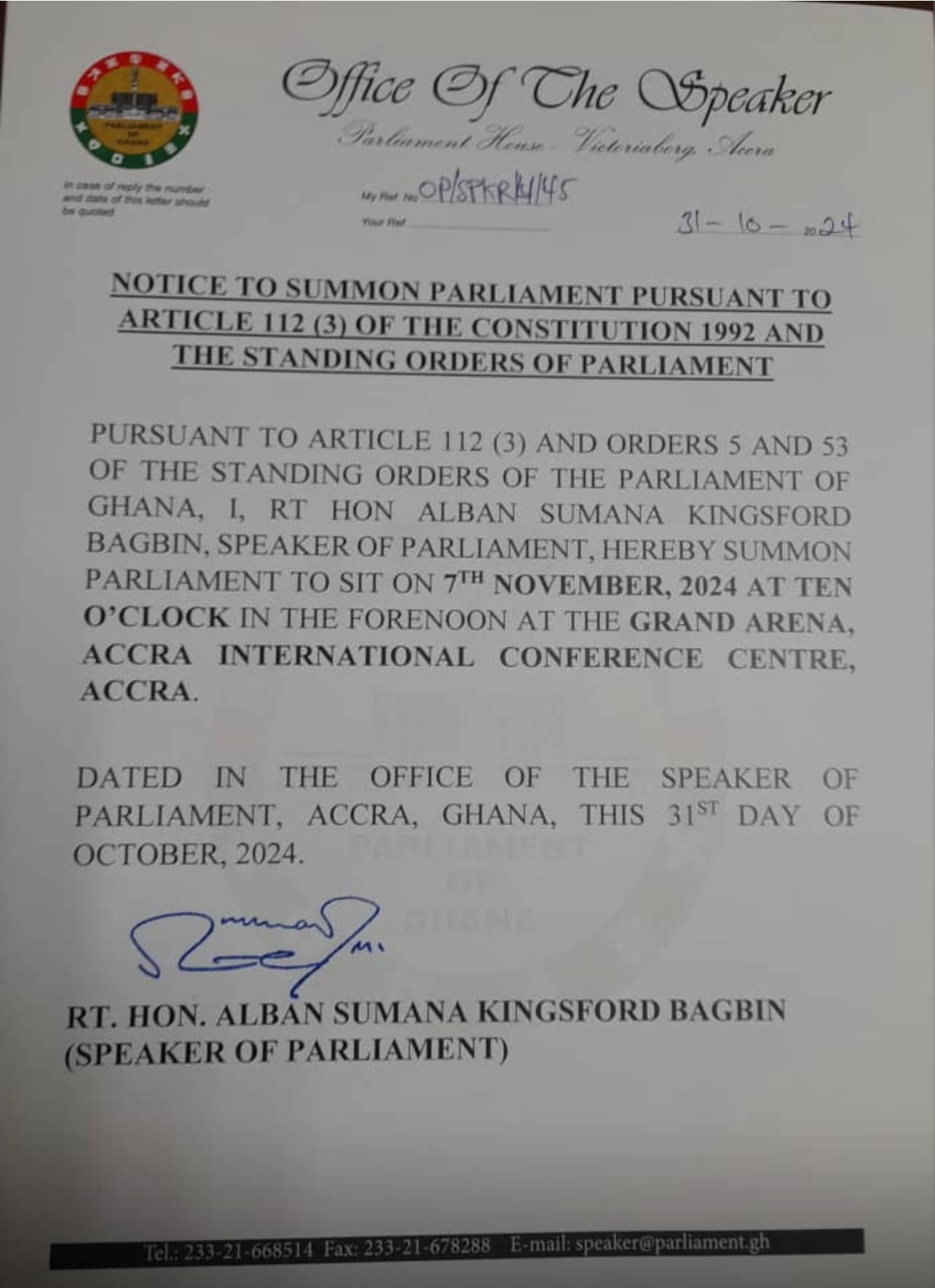 The Speaker of Parliament has recalled Members of Parliament to convene on Thursday, November 7.